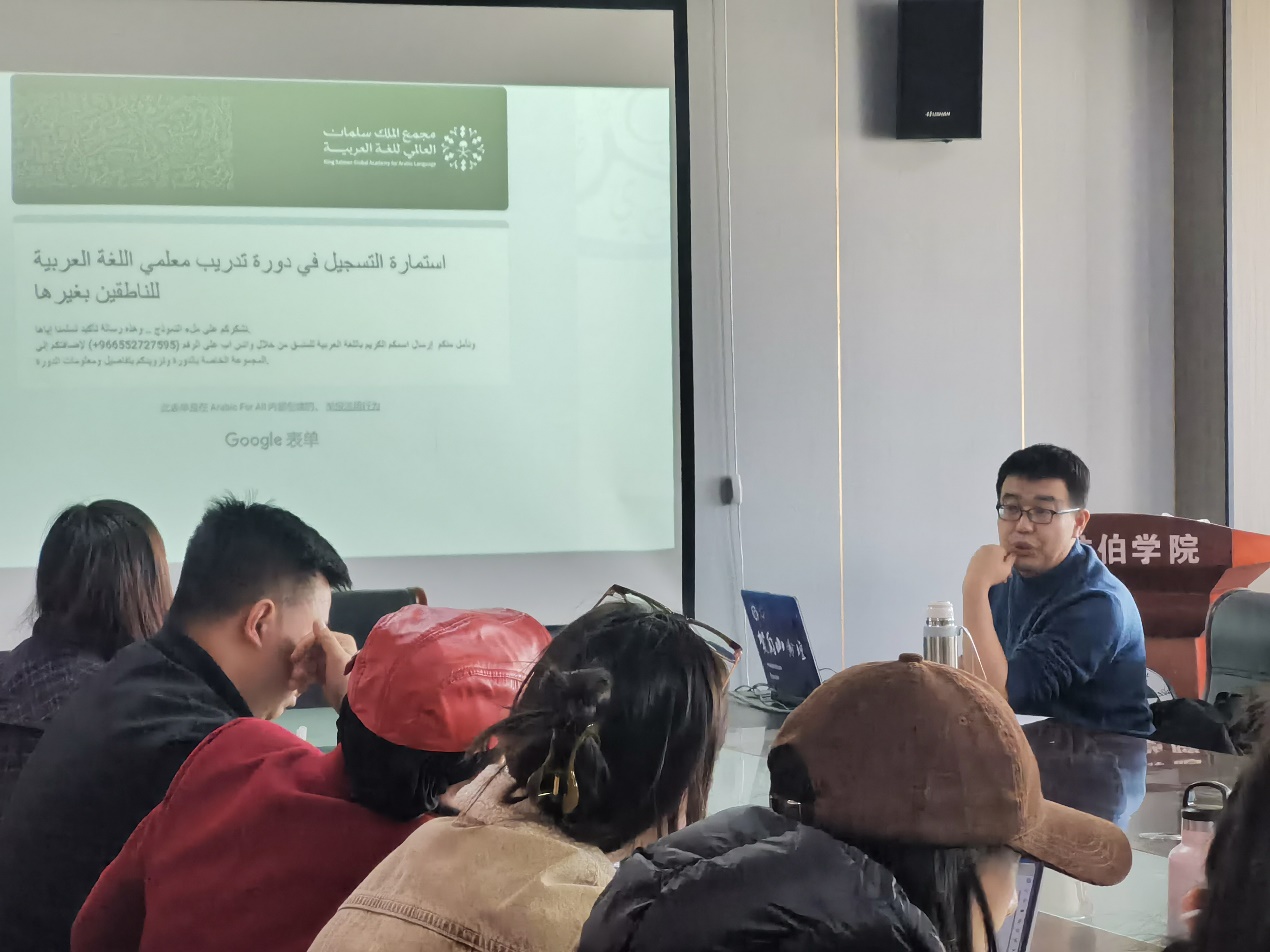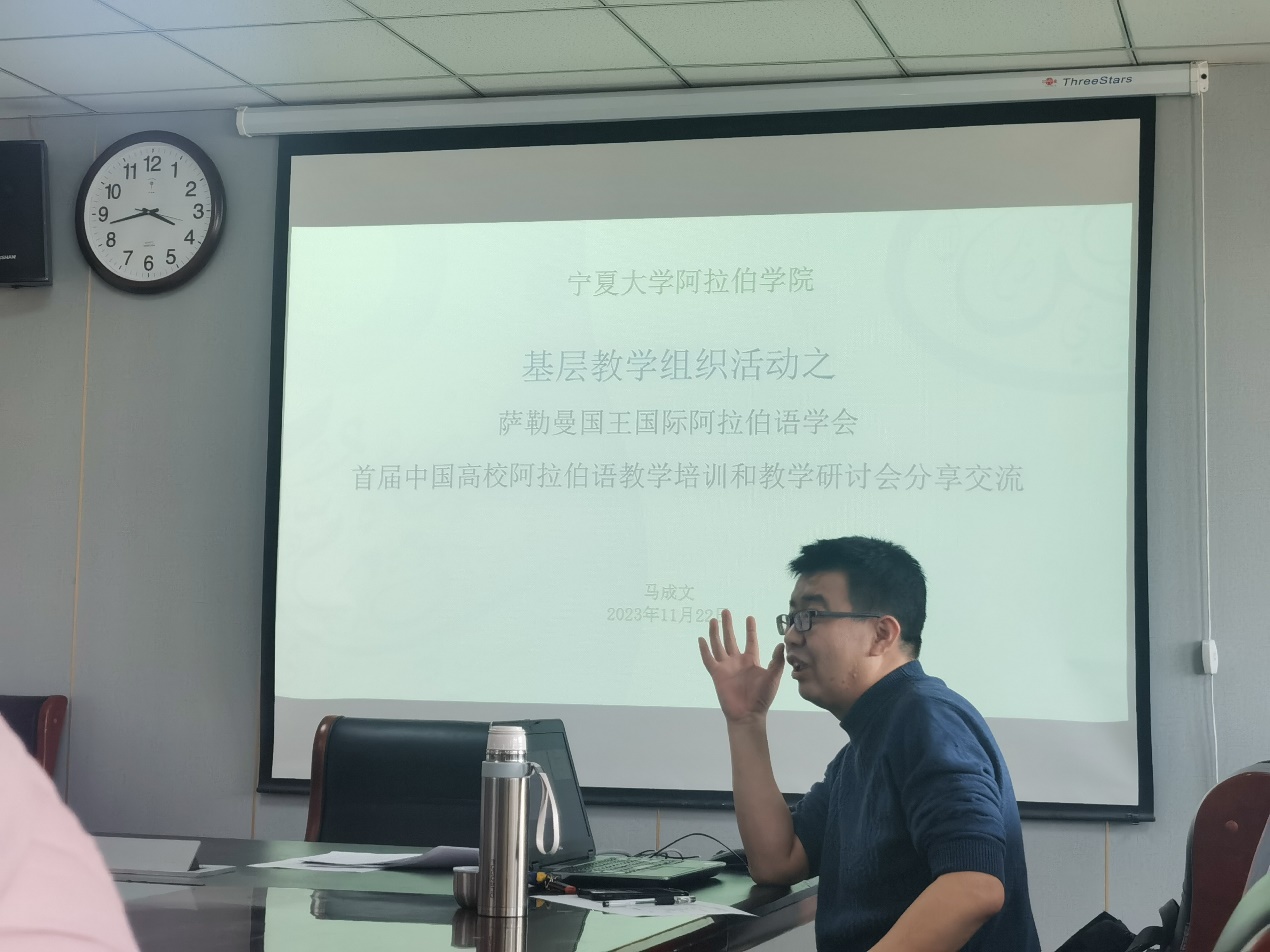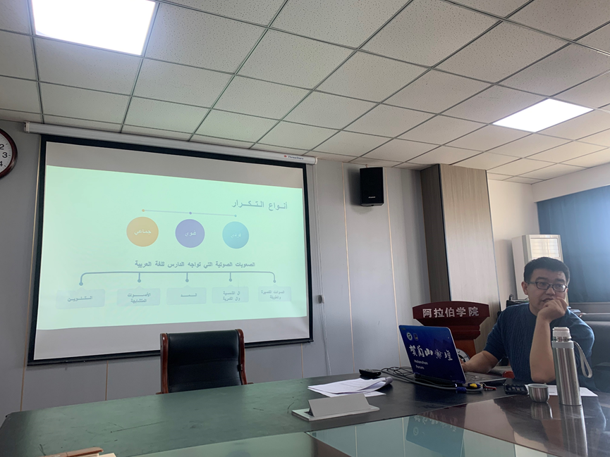 首先,马成文老师向学院领导和教师对参加萨勒曼国王国际阿拉伯语学会首届中国高校阿拉伯语教学培训和教学研讨会的总体情况和历程做了汇报。之后,从阿拉伯语语音、词汇和句型教学等案例从发,进行了阿拉伯语教学的思路、教学理念、教学方式和教学技巧方面等方面进行分享。