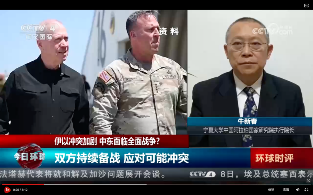 宁夏大学学术副校长、中国阿拉伯国家研究院执行院长,中国中东学会副会长、中国人民外交学会理事牛新春教授接受了中央电视台等主流媒体的采访,就伊以、黎以冲突及趋势进行了分析和解读。