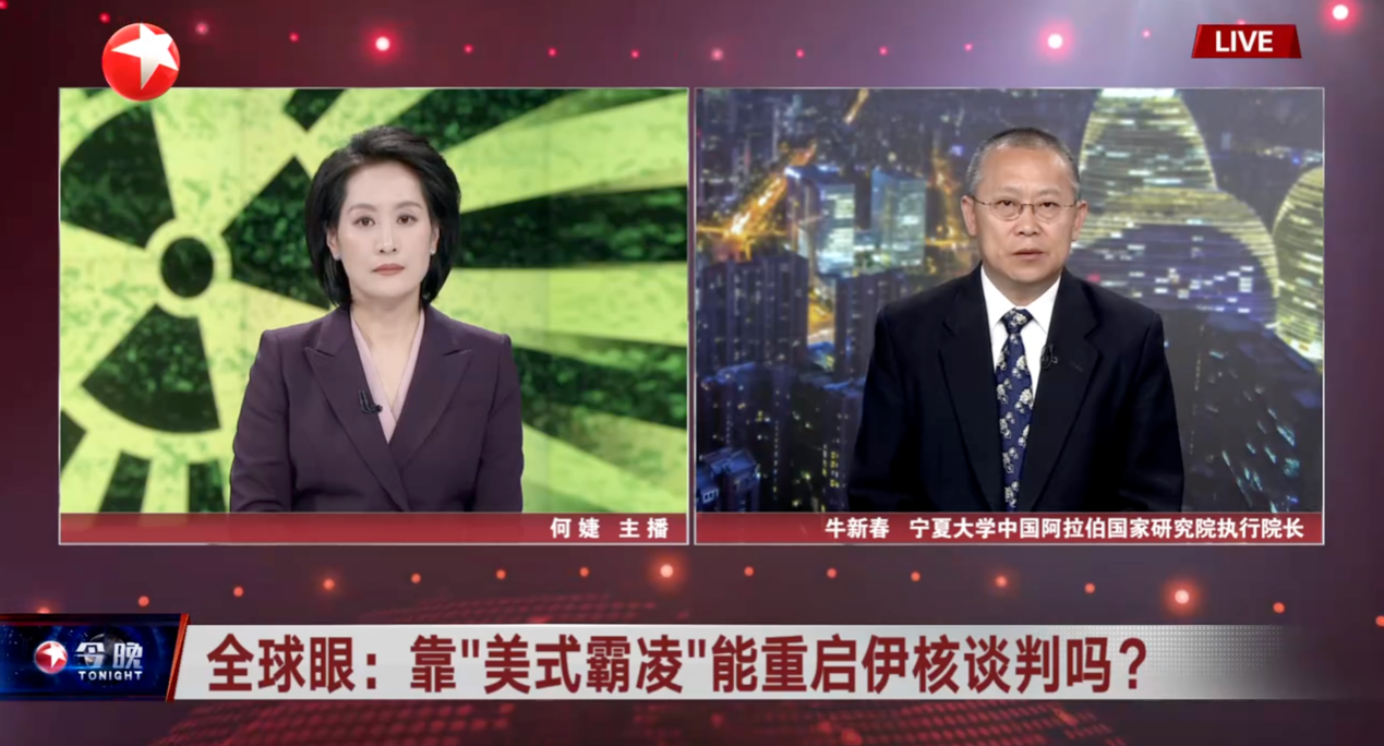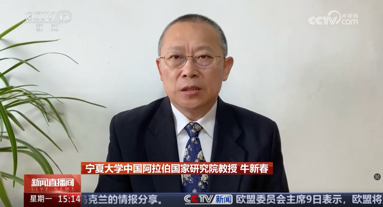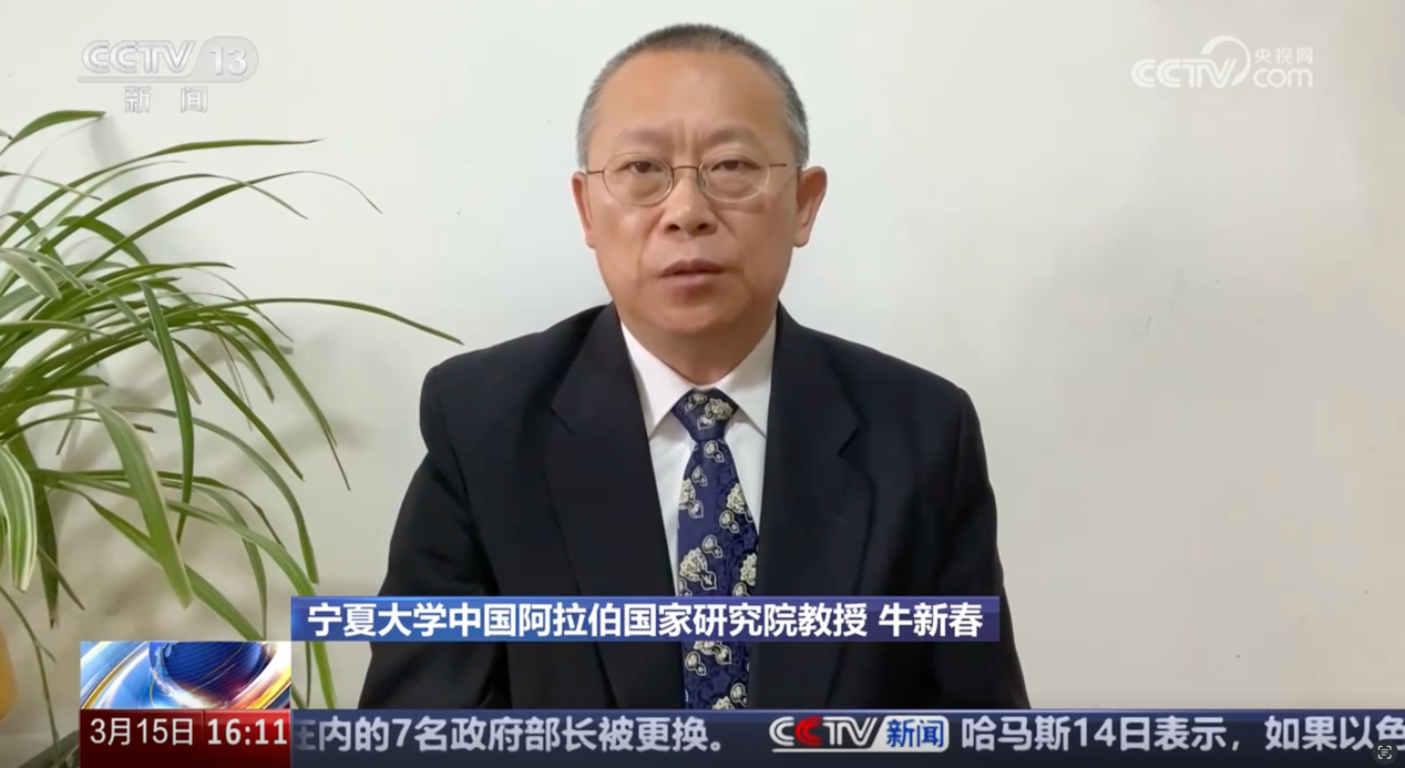2025年3月10日-2025年3月16日,宁夏大学学术副校长、中国阿拉伯国家研究院执行院长,中国中东学会副会长、中国人民外交学会理事牛新春教授就相关问题接受了中央电视台、中央广播电台、东方卫视、环球时报等主流媒体的采访,就当前局势及趋势进行了分析和解读。除此之外,牛校长应中国石油集团经济技术硏究院邀请,参加伊朗问题研讨会;应北京大学邀请参加2025年“中东局势回顾与展望”研讨会;参加中国人民大学国家发展与战略研究院主办,世情研究中心承办的双周政策分析会(第十一期)暨国际热点问题研讨会(第二十期);《玉渊谭天》微信公众号引用牛校长观点。