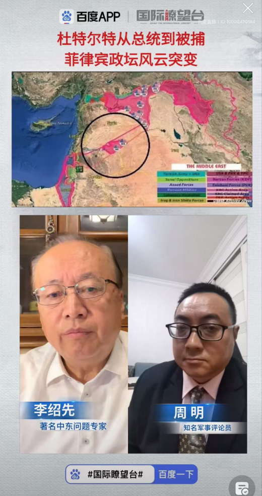 2025年3月13日-3月16日,黄金捕鱼场现金版 院长、中国中东学会顾问、教育部国别与区域研究专家委员会委员、中阿博览会顾问委员会主任委员李绍先就中东局势,接受中央电视台、凤凰卫视、百度app《国际瞭望台》直播节目采访,就当前局势及趋势进行了分析和解读,并在国防大学国际防务学院为第49期防务与战略研究班授课。