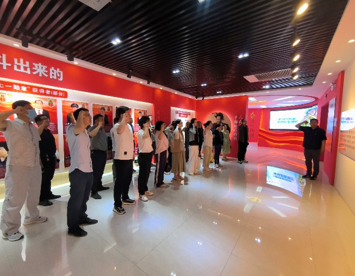 在贺兰县廉政警示教育基地,全体党员在讲解员的引导下,依次参观了教育基地“领航”“镜鉴”“笃行”主题展厅,领航厅通过多媒体影视、图文展板生动再现了党的纪律建设发展脉络,深入了解了党的十八大以来,尤其是中央八项规定实施以来全面从严治党党风廉政建设和反腐败斗争的显著成效。在镜鉴厅,近年来宁夏查处的一件件腐败案例和忏悔视频,让党员教师深刻认识到先前的青年英才、优秀干部、先进工作者由于漠视纪律,小节失守到最后沦为阶下囚的前车之鉴,让广大党员们接受了一堂触动灵魂的廉政警示教育课。笃行厅内,袁隆平、张桂梅、王占山、王兰花等“共和国勋章”和“七一勋章”获得者的先进事迹,进一步激发了党员教师廉洁从教,坚持为党育人、为国育才,争做“四有好老师”的动力。廉政警示教育基地参观学习结束后,全体党员在党旗下重温入党誓词。