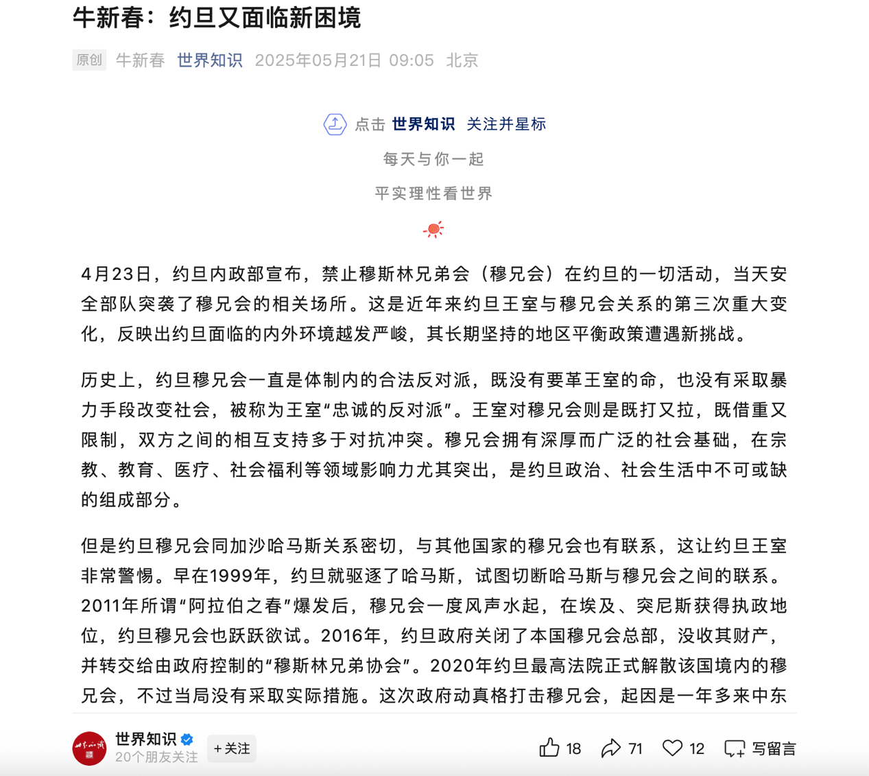 八、5月21日在《世界知识》杂志发表题为《约旦又面临新困境》文章