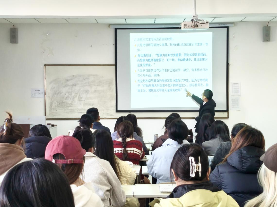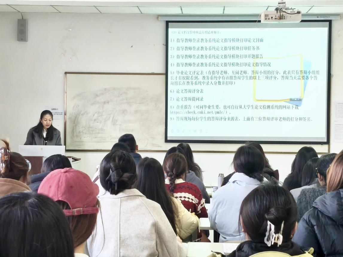 随后,独乐老师围绕毕业论文全流程管理进行系统讲解。她从论文撰写的规范、论文指导的注意事项、答辩环节的流程要求,到论文的提交要求、格式标准及装订细则等方面逐一拆解说明,明确各阶段时间节点与任务重点,为毕业生梳理出清晰的论文推进时间表,助力大家有条不紊地完成毕业论文相关工作。