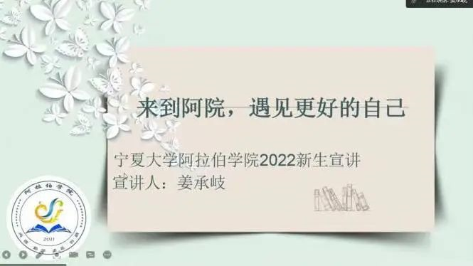 姜承岐学长,张璐薇学姐分享了阿语的有效学习方法,推荐了阿语视频,电影及书籍,除专业的学习外,也介绍了宁夏大学丰富多彩的校园生活,展示了宁大的醉人美景、激情竞赛及热心服务。