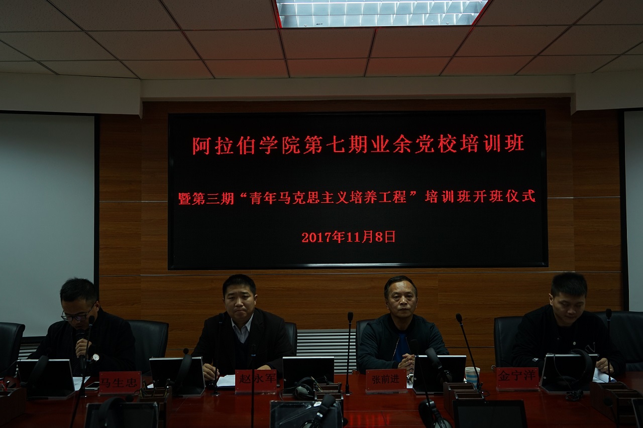 在学院报告厅举行第七期业余党校培训班暨第三期“青年马克思主义培养工程”培训班开班仪式。学院党总支书记张前进、党总支副书记赵永军、学生工作办公室主任马生忠、团委副书记金宁洋出席,全体学员参加。